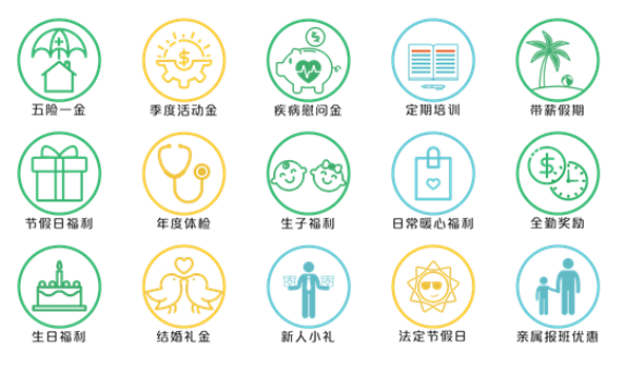 五险二金、带薪培训、节假日福利、生日福利、结婚礼金、生子福利、家属福利、阶段性福利、季度活动经费、住房补贴、交通补贴、餐饮补贴……